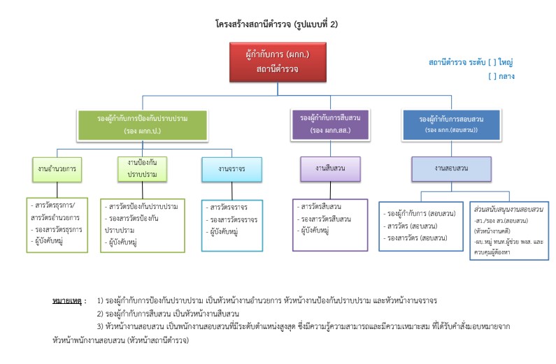 มีหน้าที่เกี่ยวกับการอำนวยการ การวางแผน การตรวจสอบติดตามและประเมินผลงานที่เกี่ยวกับนโยบาย ยุทธศาสตร์ และแผนงานของสถานีตำรวจ งานการบริหารบุคลากร งานจเรตำรวจงานกิจการพิเศษ งานความมั่นคง การศึกษา การฝึกอบรม งานวิชาการ สวัสดิการ การพัฒนา การบริหารจัดการ งบประมาณ การเงิน การพัสดุ การพลาธิการและสรรพาวุธ การส่งกำลังบำรุง รวมทั้งลักษณะงานอื่น ๆ ที่เกี่ยวข้องหรือเป็นส่วนประกอบของงานดังกล่าว เพื่อส่งเสริมหรือสนับสนุนการปฏิบัติงานของสถานีตำรวจ